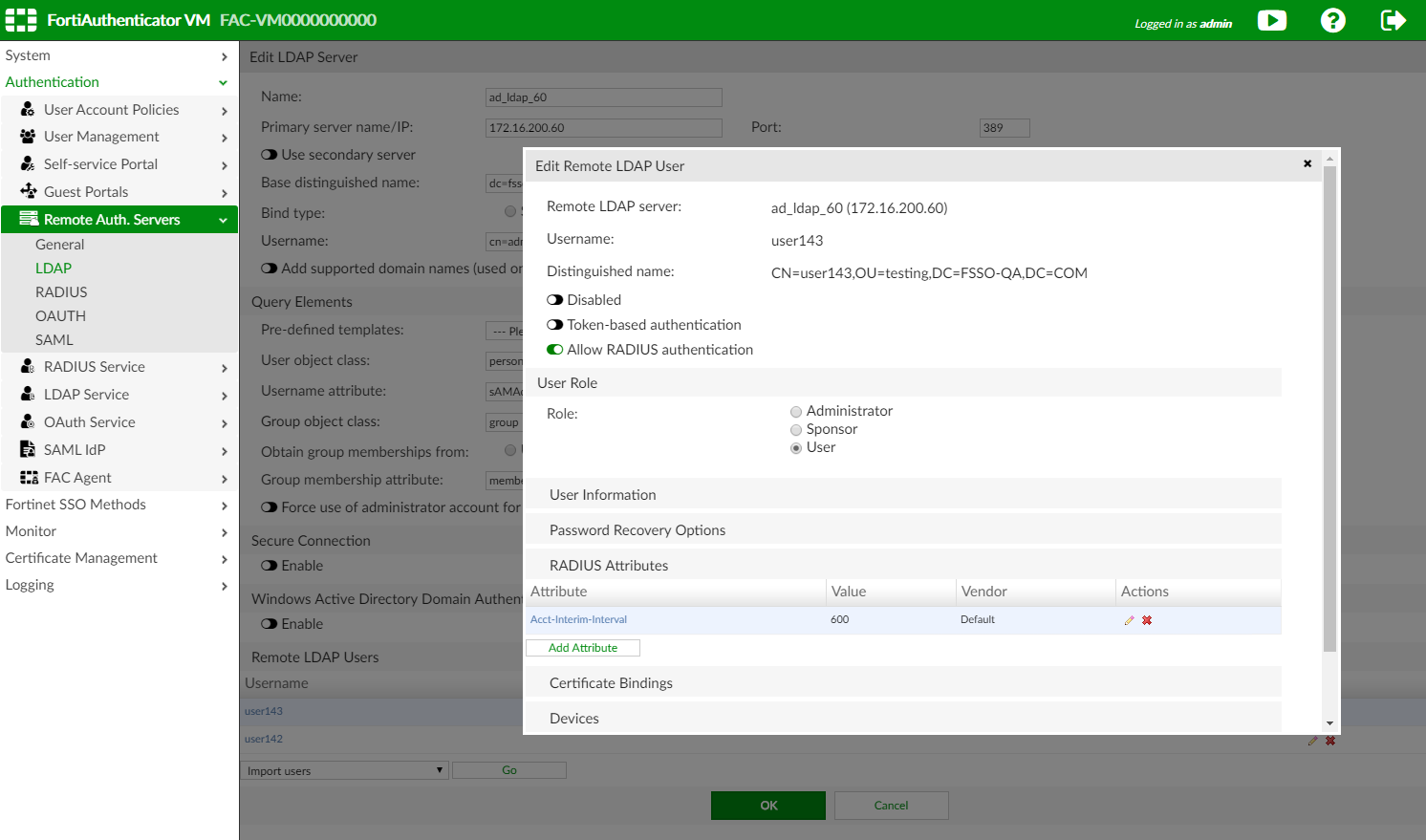 - Edit each user to confirm that they have the RADIUS attribute Acct-Interim-Interval. This attribute is used by FortiGate to send interim update account messages to the RADIUS server.
