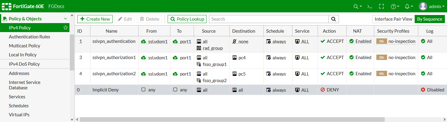 config firewall policy edit 1 set name "sslvpn_authentication" set srcintf "ssl.vdom1" set dstintf "port1" set srcaddr "all" set dstaddr "none" set action accept set schedule "always" set service "ALL" set logtraffic all set groups "rad_group" set nat enable next edit 3 set name "sslvpn_authorization1" set srcintf "ssl.vdom1" set dstintf "port1" set srcaddr "all" set dstaddr "pc4" set action accept set schedule "always" set service "ALL" set logtraffic all set groups "fsso_group1" set nat enable next edit 4 set name "sslvpn_authorization2" set srcintf "ssl.vdom1" set dstintf "port1" set srcaddr "all" set dstaddr "pc5" set action accept set schedule "always" set service "ALL" set logtraffic all set groups "fsso_group2" set nat enable next end