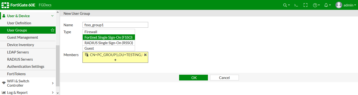 - Enter a name for the group and set the Type to Fortinet Single Sign-On (FSSO).