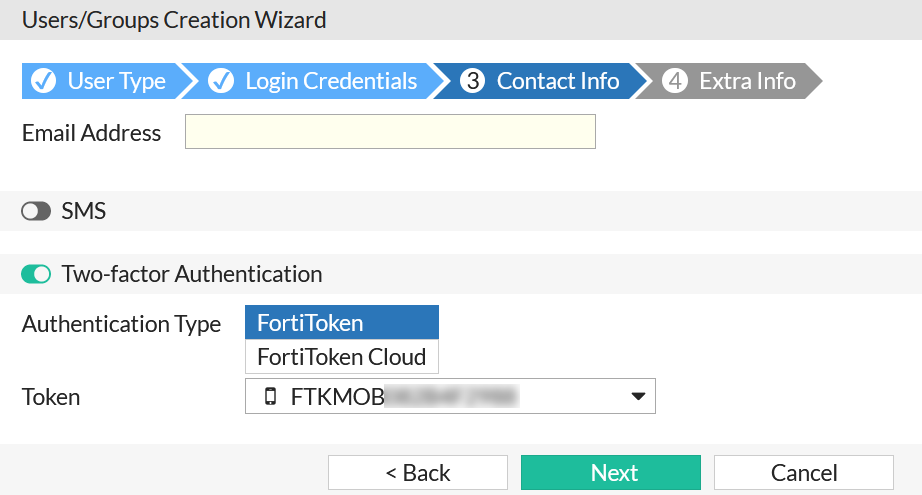 - Enter the user's email address in the Email Address field. This is the email where the user will receive the QR code for activation of the FortiToken.