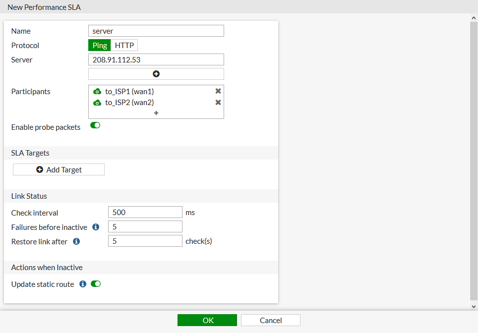 In this example, the detection server IP address is 208.91.112.53. A performance SLA is created so that, if ping fails per the metrics defined, the routes to that interface are removed and traffic is detoured to the other interface. The ping protocol is used, but other protocols could also be selected as required.