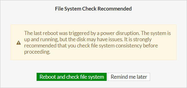 By default, the automatic file system check is disabled. When an administrator logs in after an ungraceful shutdown, a warning message appears advising them to manually run a file system check.