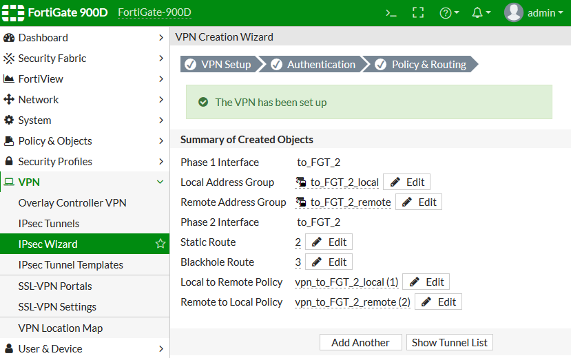A confirmation screen shows a summary of the configuration including the firewall address groups for both the local and remote subnets, static routes, and security policies.