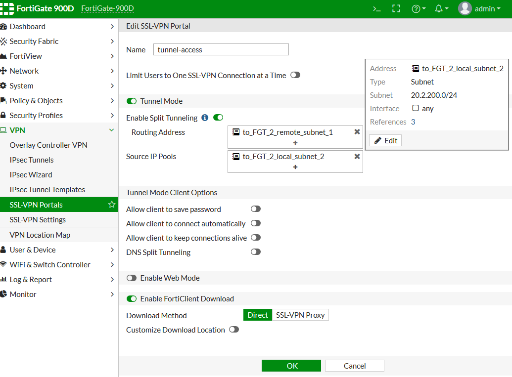 - Set the Local Subnets to include the internal and SSL VPN subnets for FGT_2.