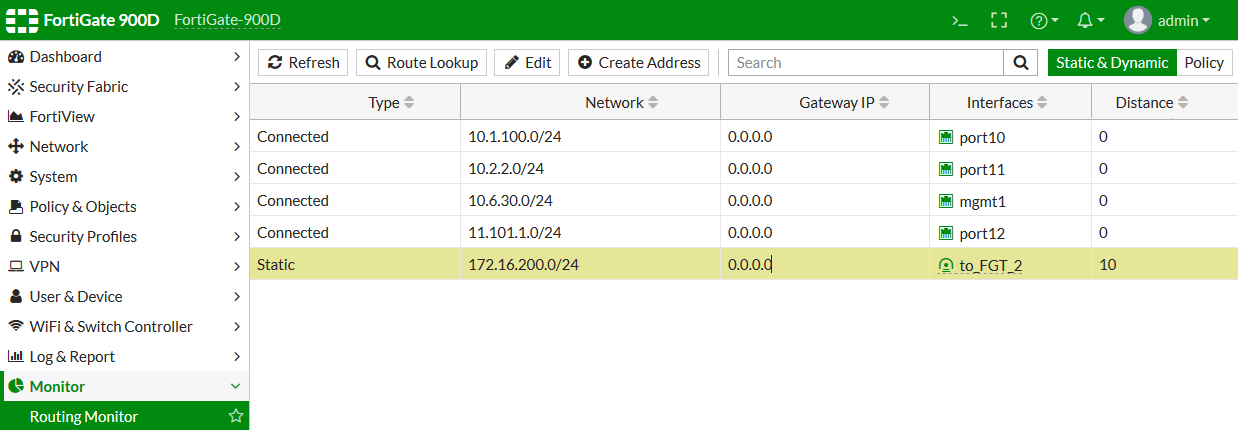 - Go to Monitor > Routing Monitor and verify that the routes for the IPsec and SSL VPNs are added.