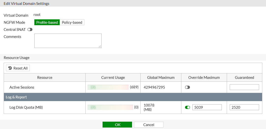 By default, all per-VDOM resource settings are set to have no limits. This means that any single VDOM can use all of the FortiGate device's resources. This could deprive other VDOMs of the resources that they require, to the point that could be unable to function. We recommend settings maximum values on the resources that are vital to you.