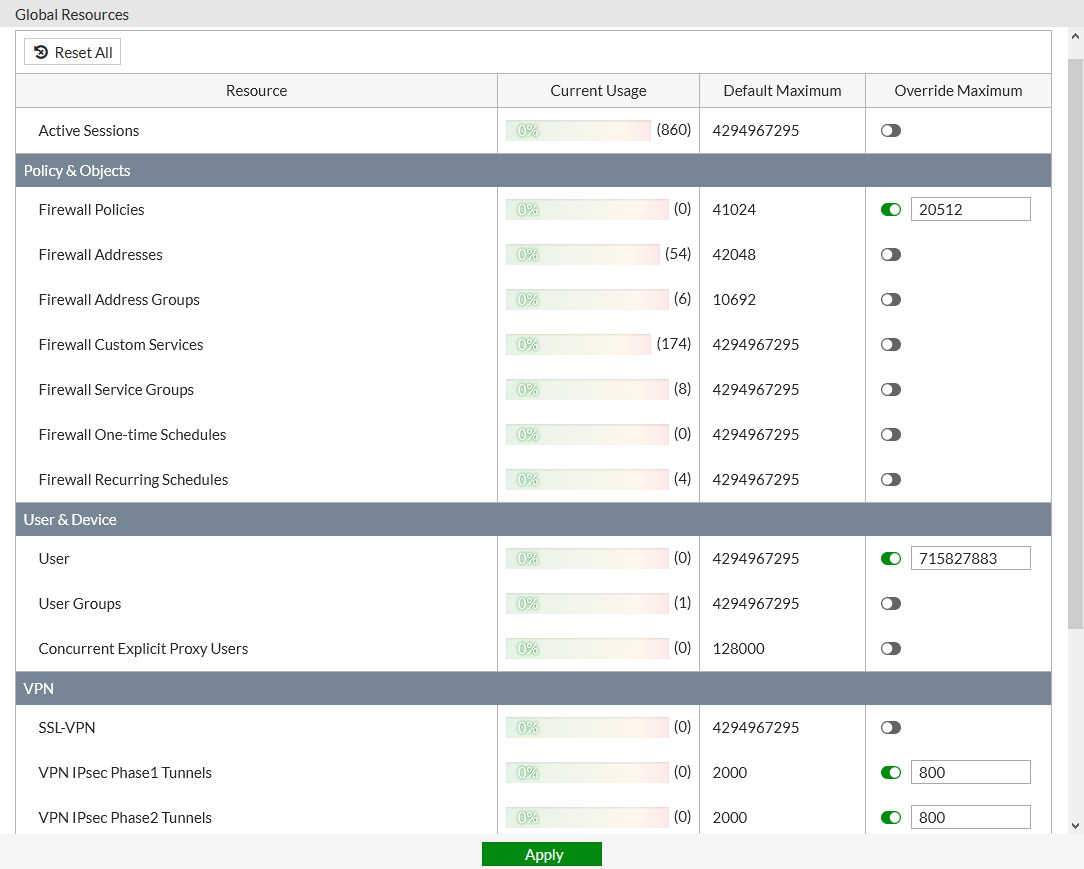 - In the Global VDOM, go to System > Global Resources.