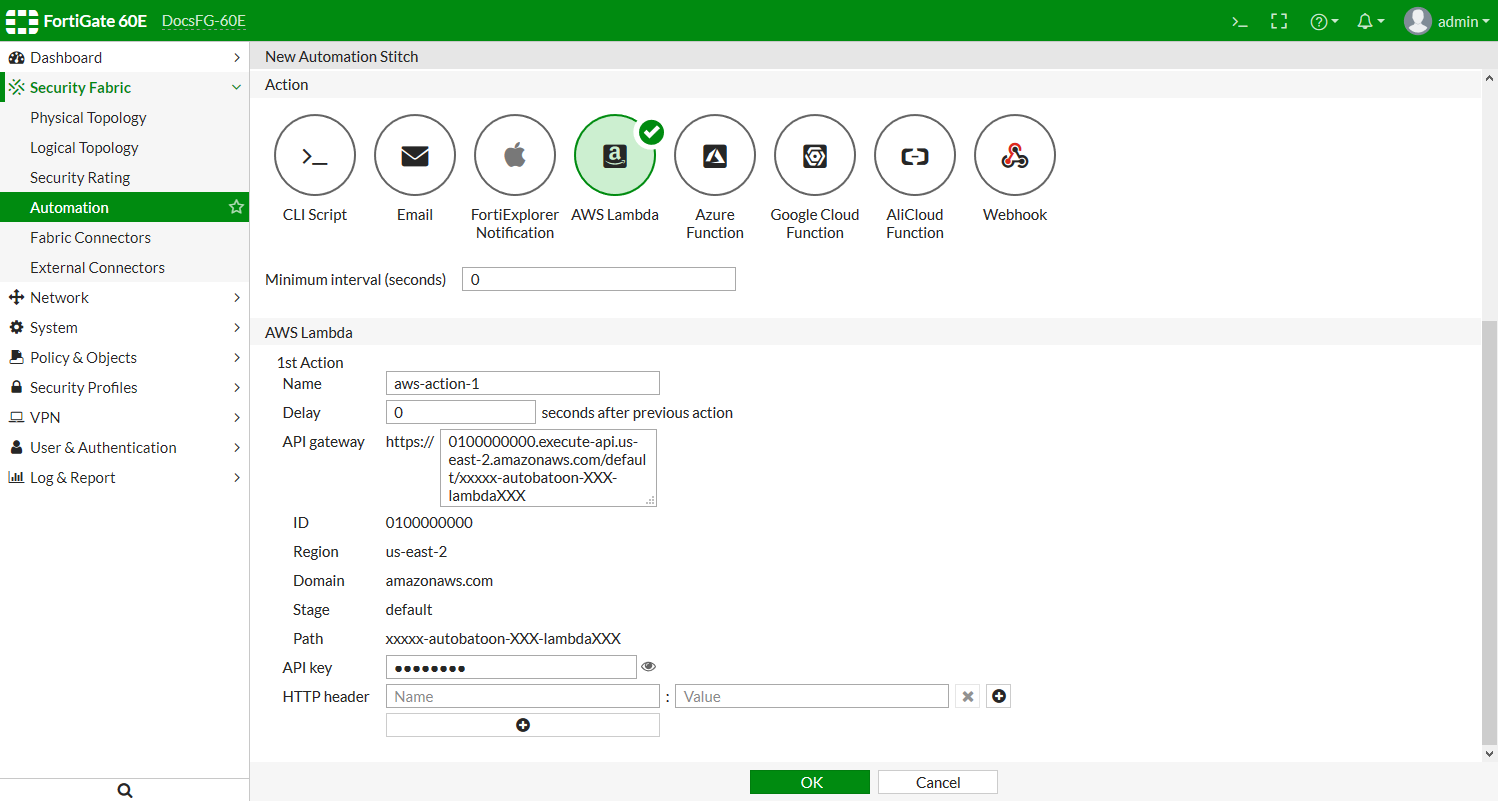 config system automation-action edit "aws-action-1" set action-type aws-lambda set aws-api-id "0100000000" set aws-region "us-east-2" set aws-api-stage "default" set aws-api-path "xxxxx-autobatoon-XXX-lambdaXXX" set aws-api-key ************* next end - Create an automation trigger: