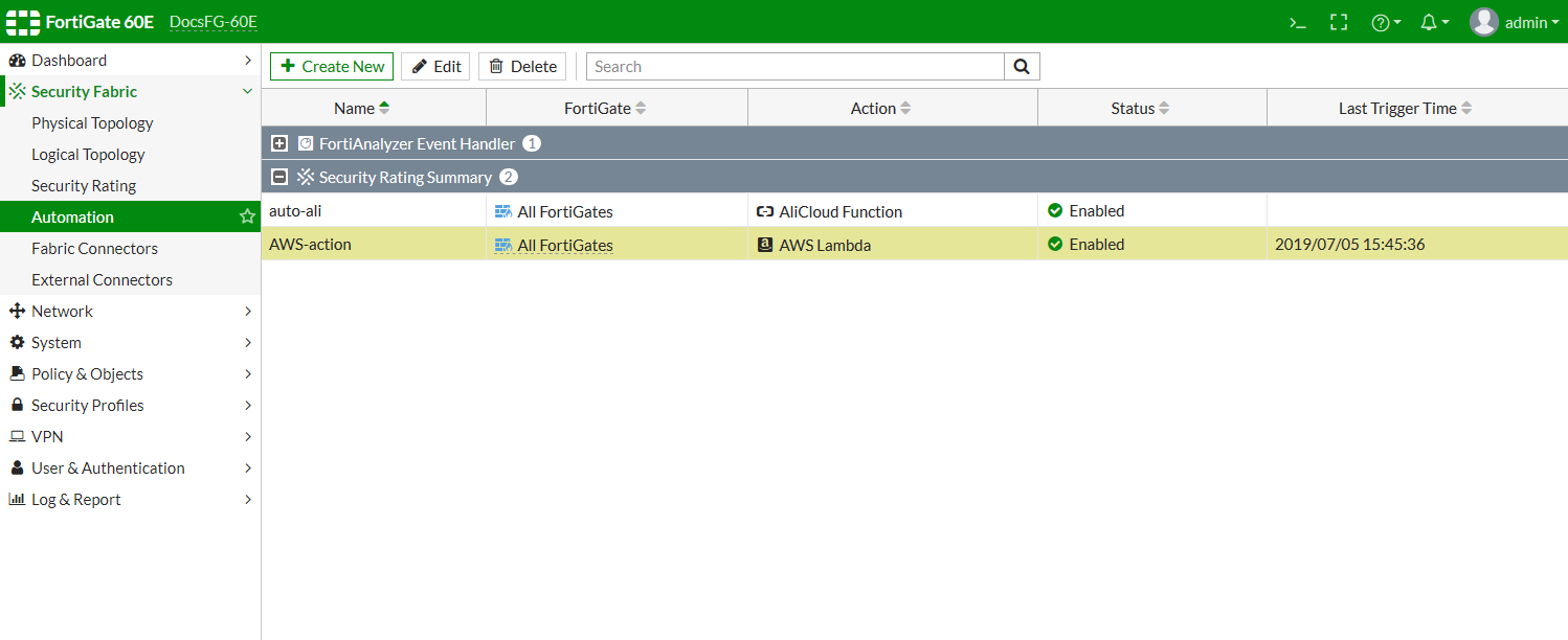 config system automation-trigger edit "auto-aws" set event-type security-rating-summary next end - Create the automation stitch: