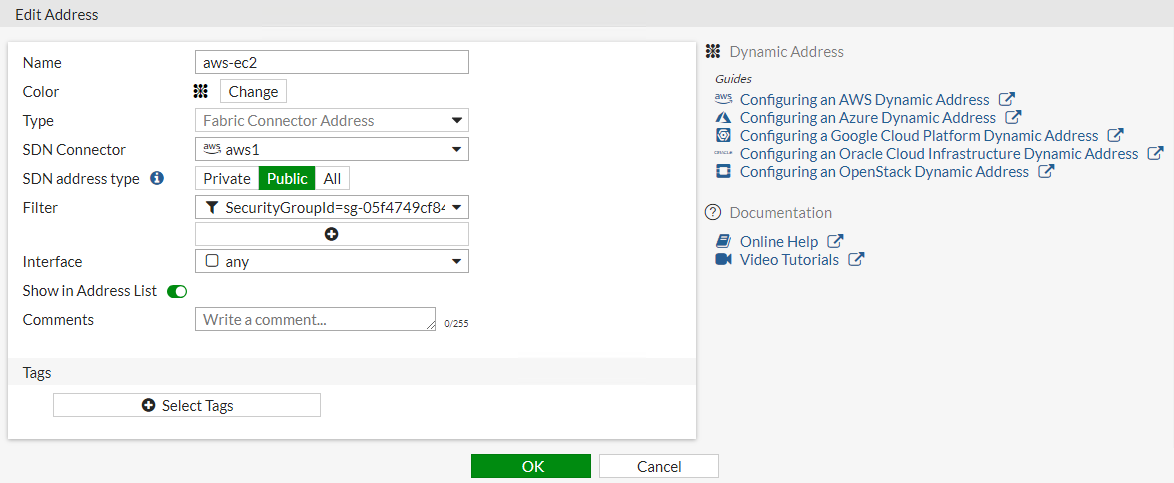Create a dynamic firewall address for the configured AWS SDN connector: