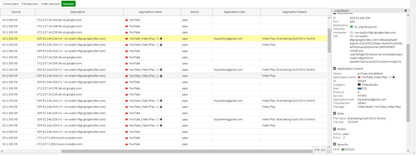 In this example, note the Application User and Application Details. Also note that the Application Control ID is 38569 showing that this entry was triggered by the application sensor YouTube_Video.Play.