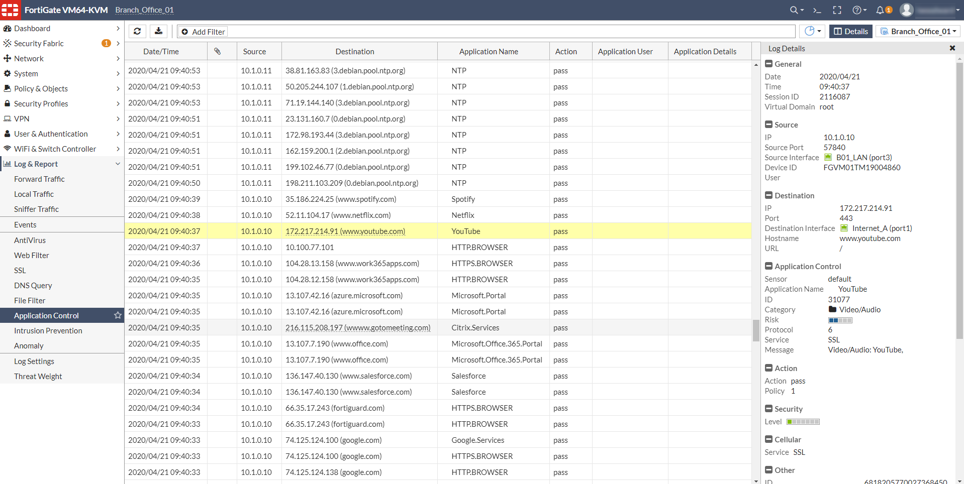 - On the FortiGate, go to Log & Report > Application Control and look for log entries for browsing and playing YouTube videos.