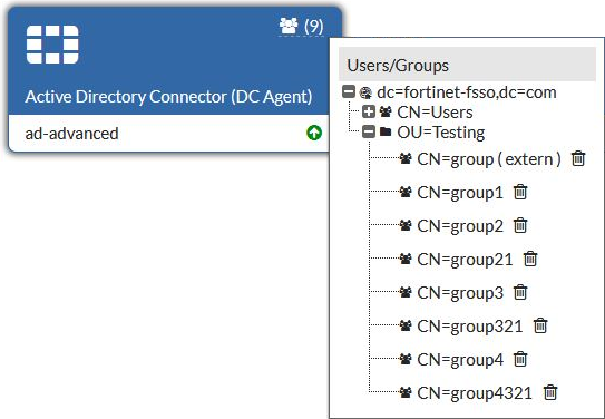 - To view the AD user groups that are retrieved by the FSSO agent, hover the cursor over the group icon on the fabric connector listing.