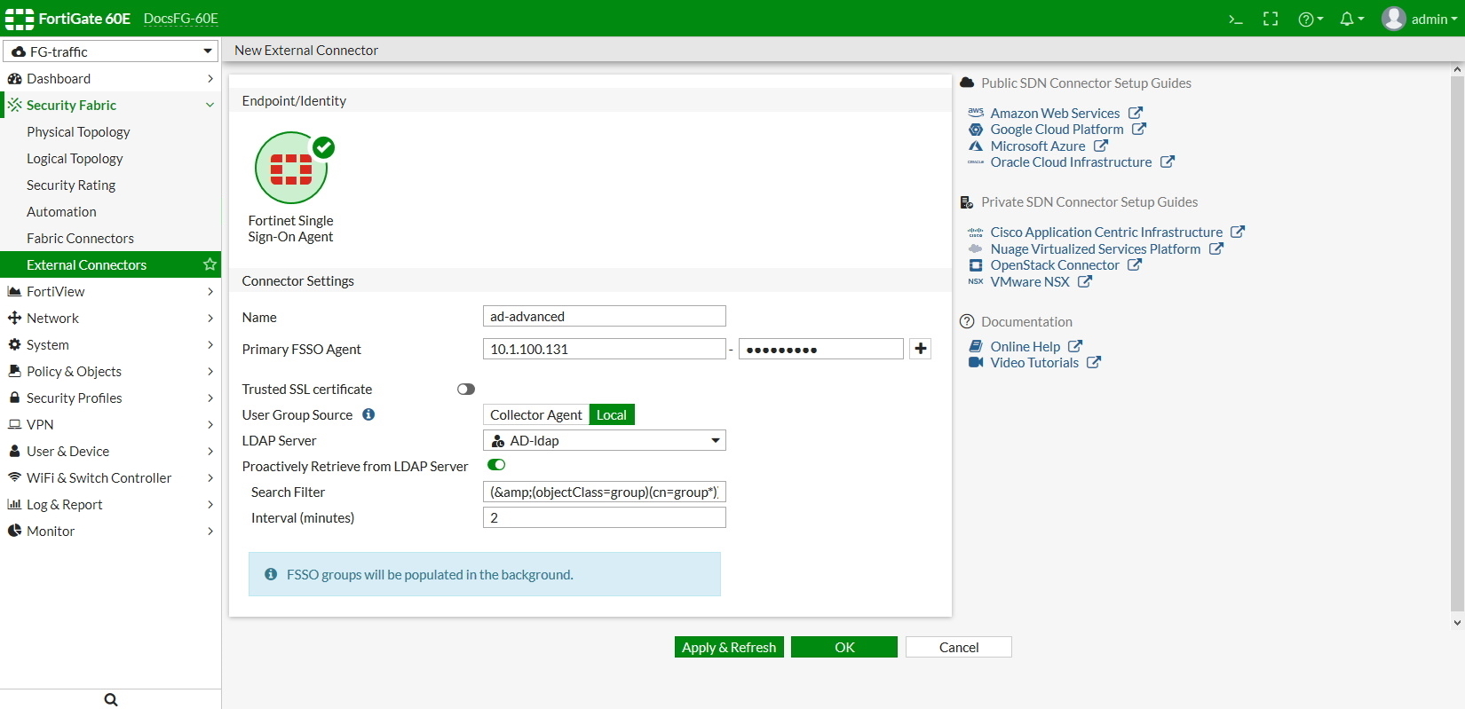 - Set the Interval (minutes) to configure how often the FortiGate contacts the remote AD LDAP server to update the group information.