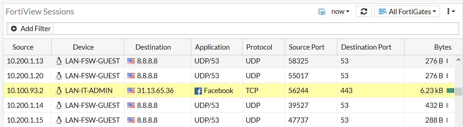 To view the FortiView Sessions dashboard, go to Dashboard > FortiView Sessions.