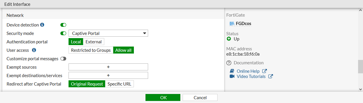 config system interface edit <interface> set security-mode {none | captive-portal} set security-external-web <string> set replacemsg-override-group <group> set security-redirect-url <string> set security-exempt-list <list> set security-groups <group(s)> next end