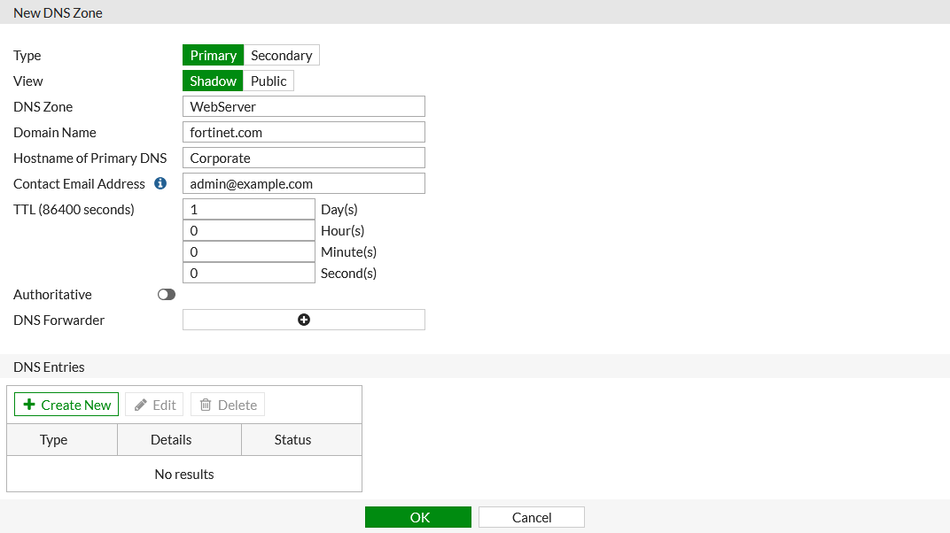 - Enter the Domain Name of the zone, for example, fortinet.com.