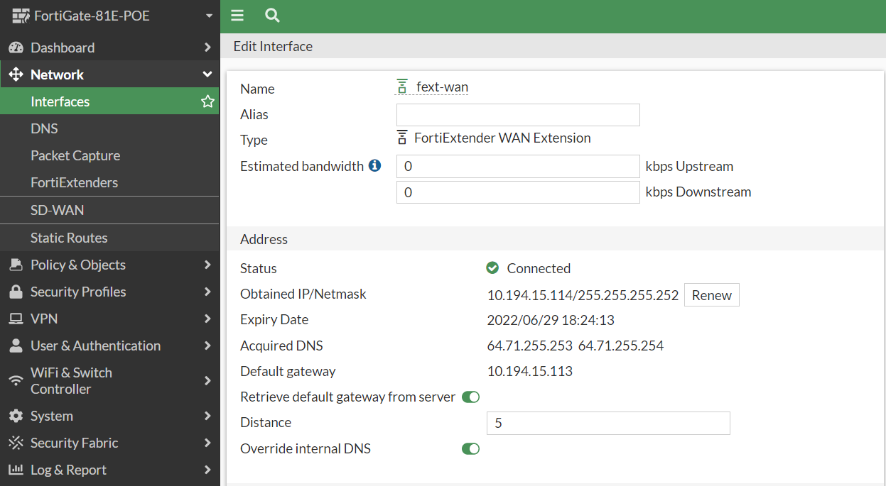 After successful FortiExtender deployment, FortiGate can retrieve the gateway IP address from the wireless carrier through FortiExtender.