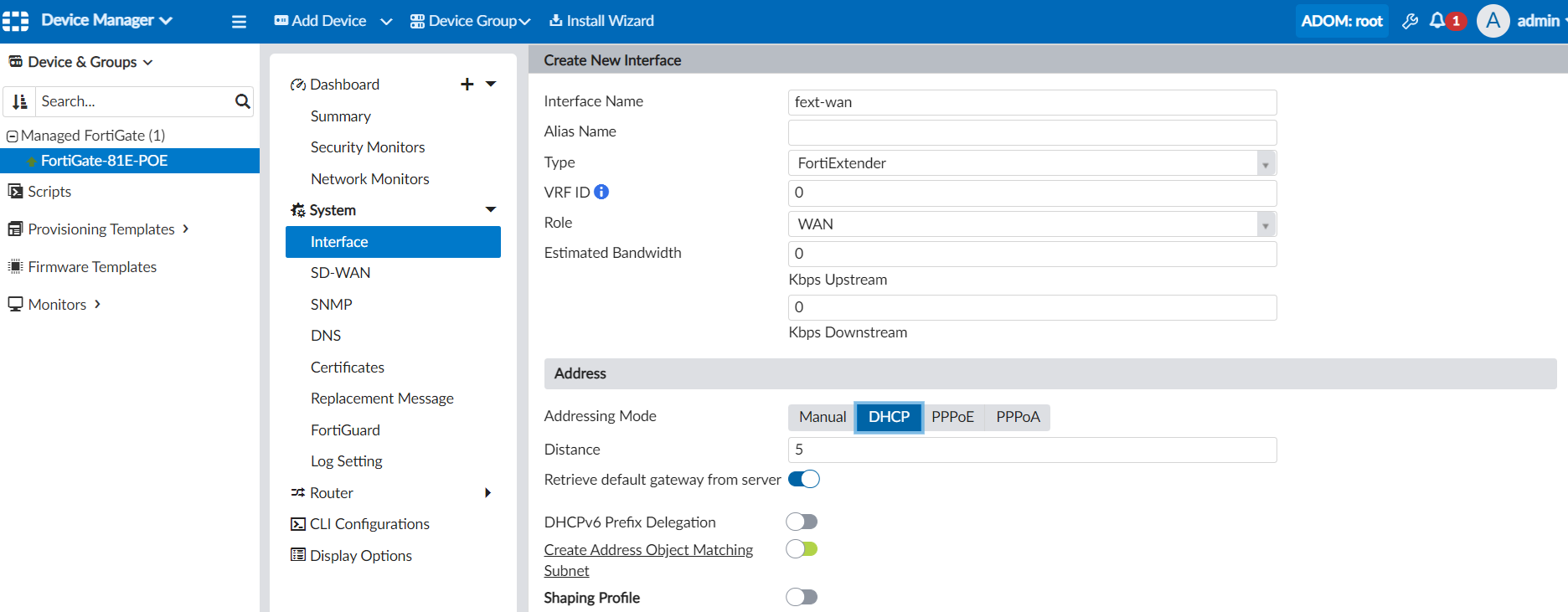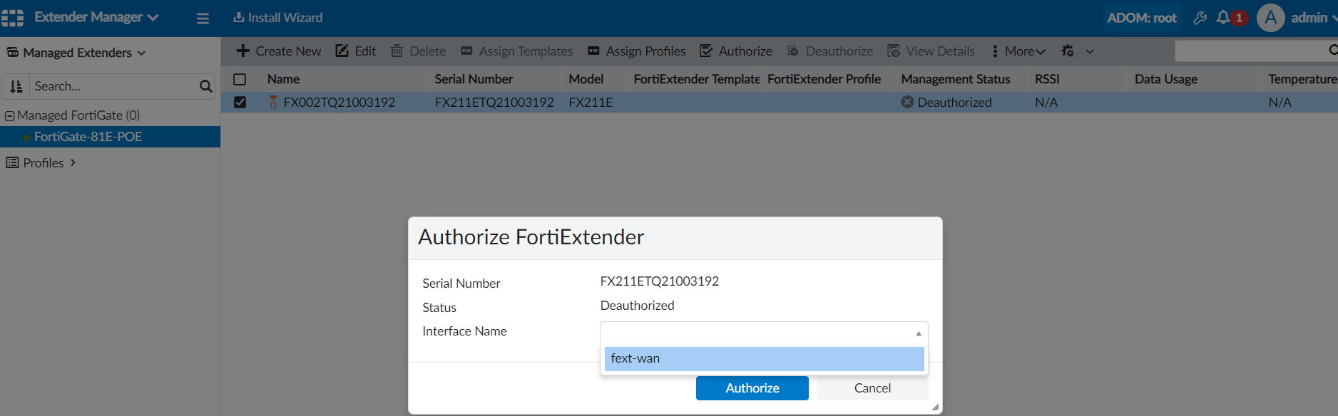 In FortiManager, authorize FortiExtender by assigning the FEXT type interface (created in FGT).