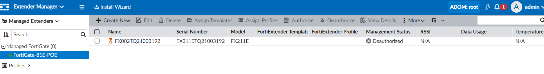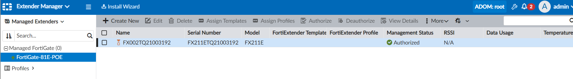 After a few minutes, FortiExtender is displayed as authorized in FortiManager.