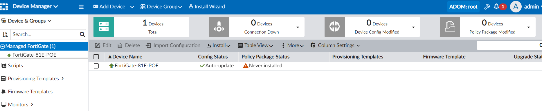 In FortiManager, go to Device Manager > Device & Groups to view the managed FortiGate-81E-POE.