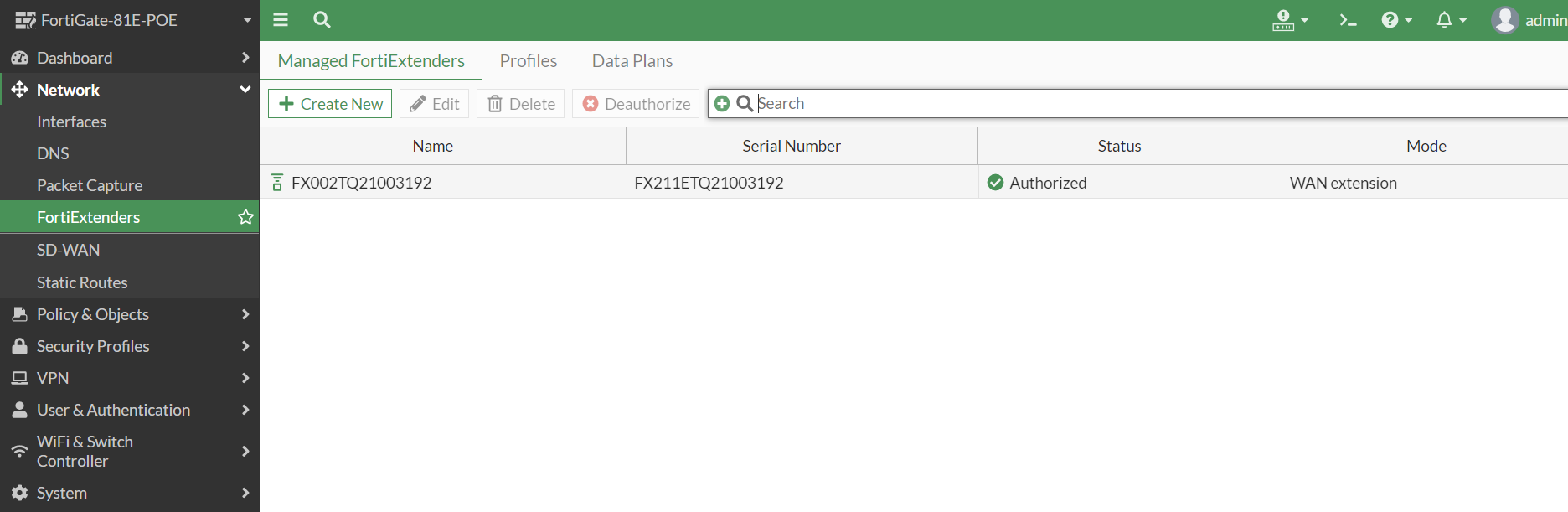 In FortiOS, go to Network > FortiExtenders to view the authorized device. The FortiExtender deployment is complete.