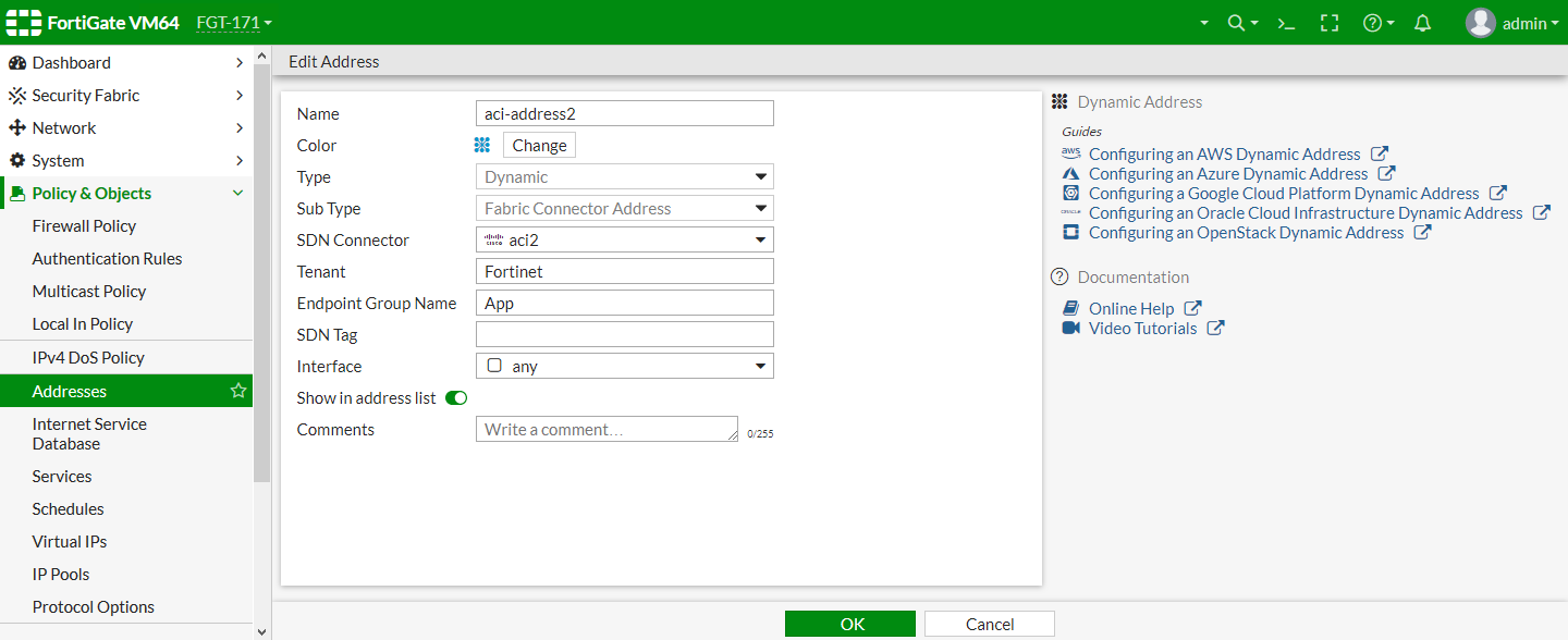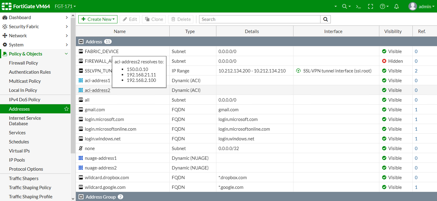 config firewall address edit "aci-address1" set type dynamic set sdn "aci1" set color 17 set tenant "wqdai-ten" set epg-name "EPG-in" set sdn-tag "fffff" next edit "aci-address2" set type dynamic set sdn "aci2" set color 17 set tenant "Fortinet" set epg-name "App" next end