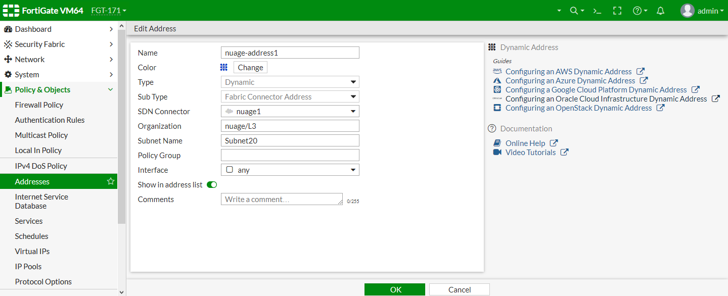 config firewall address edit "nuage-address1" set type dynamic set sdn "nuage1" set color 19 set organization "nuage/L3" set subnet-name "Subnet20" next edit "nuage-address2" set type dynamic set sdn "nuage2" set color 19 set organization "nuage/L3" set subnet-name "Subnet30" next end