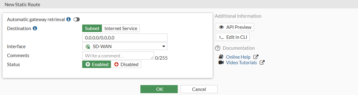 You must configure a default route for the SD-WAN. The default gateways for each SD-WAN member interface do not need to be defined in the static routes table. FortiGate will decide what route or routes are preferred using Equal Cost Multi-Path (ECMP) based on distance and priority.