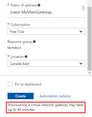 Creating the virtual network gateway might take some time. When the provisioning is done, you'll receive a notification.