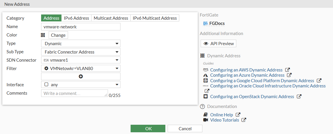- Create a dynamic firewall address for the configured VMware ESXi SDN connector: