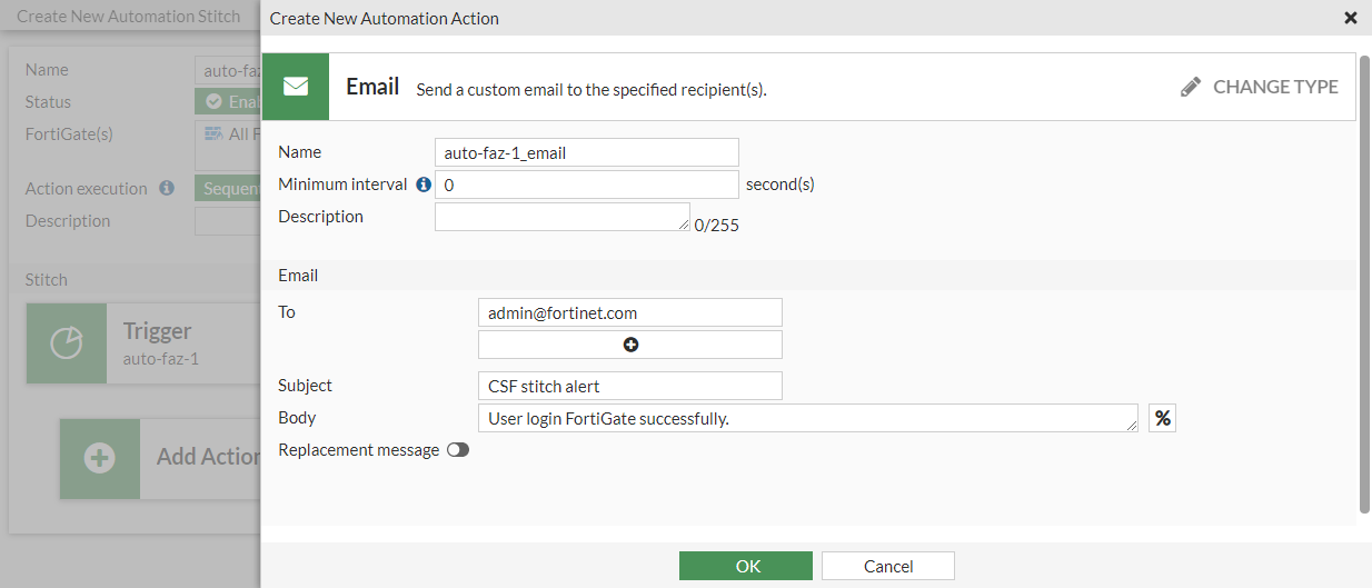 config system automation-action edit "auto-faz-1_email" set action-type email set email-to "admin@fortinet.com" set email-subject "CSF stitch alert" set message "User login FortiGate successfully." next end - Create the automation stitch: