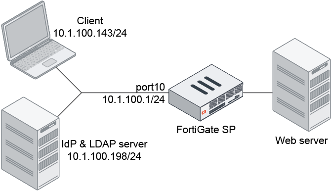 In this configuration, SAML authentication is used with an explicit web proxy. The IdP is a Windows 2016 server configured with ADFS. The LDAP and IdP servers are on the same server. The LDAP server is used as the user backend for the IdP to perform authentication; however, they are not required to be on the same server.