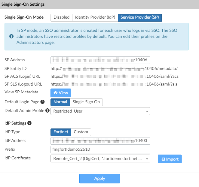 7. In FortiManager, go to System Settings > Admin > SAML SSO and in the Single Sign-On Mode section, click Service Provider (SP).