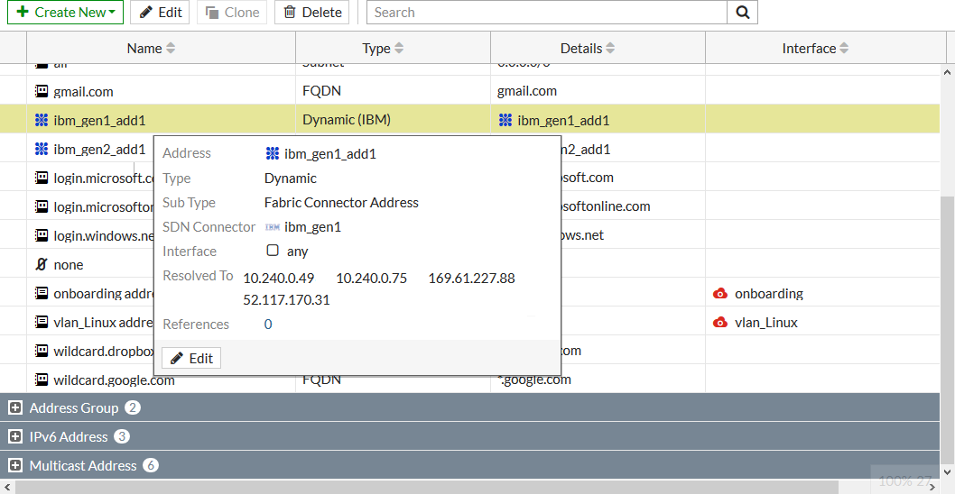 config firewall address edit "ibm_gen1_add1" set type dynamic set sdn "ibm_gen1" set color 19 set filter "Vpc=alex-vpc1" next edit "ibm_gen2_add1" set type dynamic set sdn "ibm_gen2" set color 19 set filter "ResourceGroup=alex-grp2" next end - Ensure that the connectors resolve dynamic firewall IP addresses: