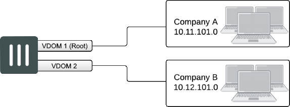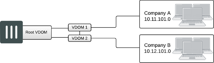 Multiple, completely separate VDOMs are created. Any VDOM can be the management VDOM, as long as it has Internet access. There are no inter-VDOM links, and each VDOM is independently managed.