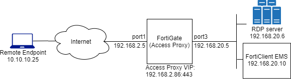 These examples assume that the FortiGate EMS fabric connector has already connected successfully, and a ZTNA server named WIN2K16-P1-RDP that forwards traffic to the RDP server has been configured.
