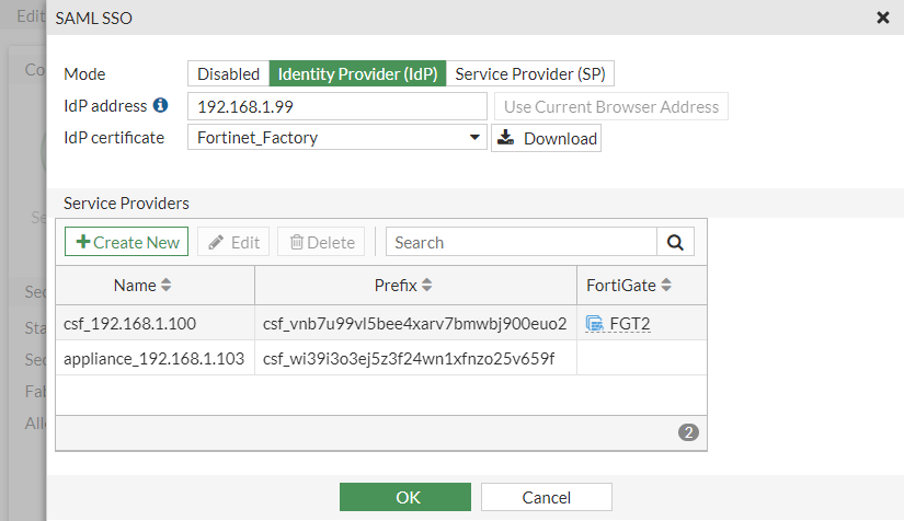 - In the SAML Single Sign-On section click Advanced Options. There should be an entry for the FortiAnalyzer in the Service Providers table (appliance_192.168.1.103).