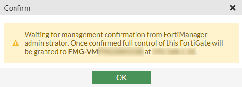 - Go to FortiManager and authorize the FortiGate. See Authorizing the FortiGate in FortiManager.
