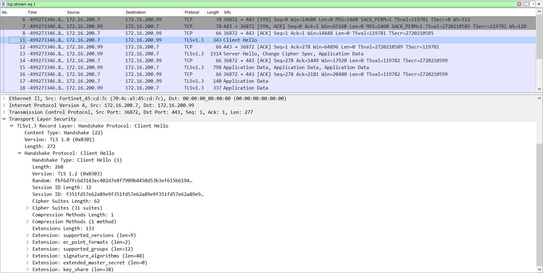 The FortiGate always strips the ALPN header from the Client Hello when forwarding. |