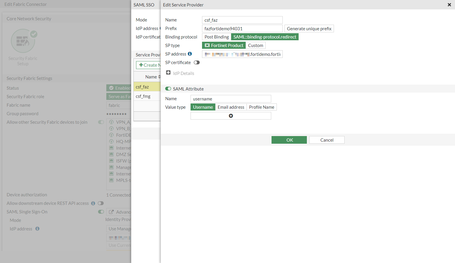 From a root FortiGate IdP, you can edit each of the FortiGate SPs. For example, you can edit a FortiGate SP to generate a new prefix, or you can add or modify SAML attributes. When you generate a new prefix value, it is propagated to the respective downstream FortiGates.