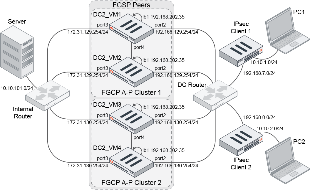 The following configurations and example demonstrates PC1 initiating traffic to the Server. First, a dialup tunnel is formed between FortiGate IPsec Client 1 and DC2_VM1, which allows traffic to go through. IPsec SAs are synchronized to the FGCP standby unit, and to the FGSP peer. Upon failure of DC2_VM1, DC2_VM2 takes over as the primary of the HA cluster, and assumes the primary role for the failover tunnels.