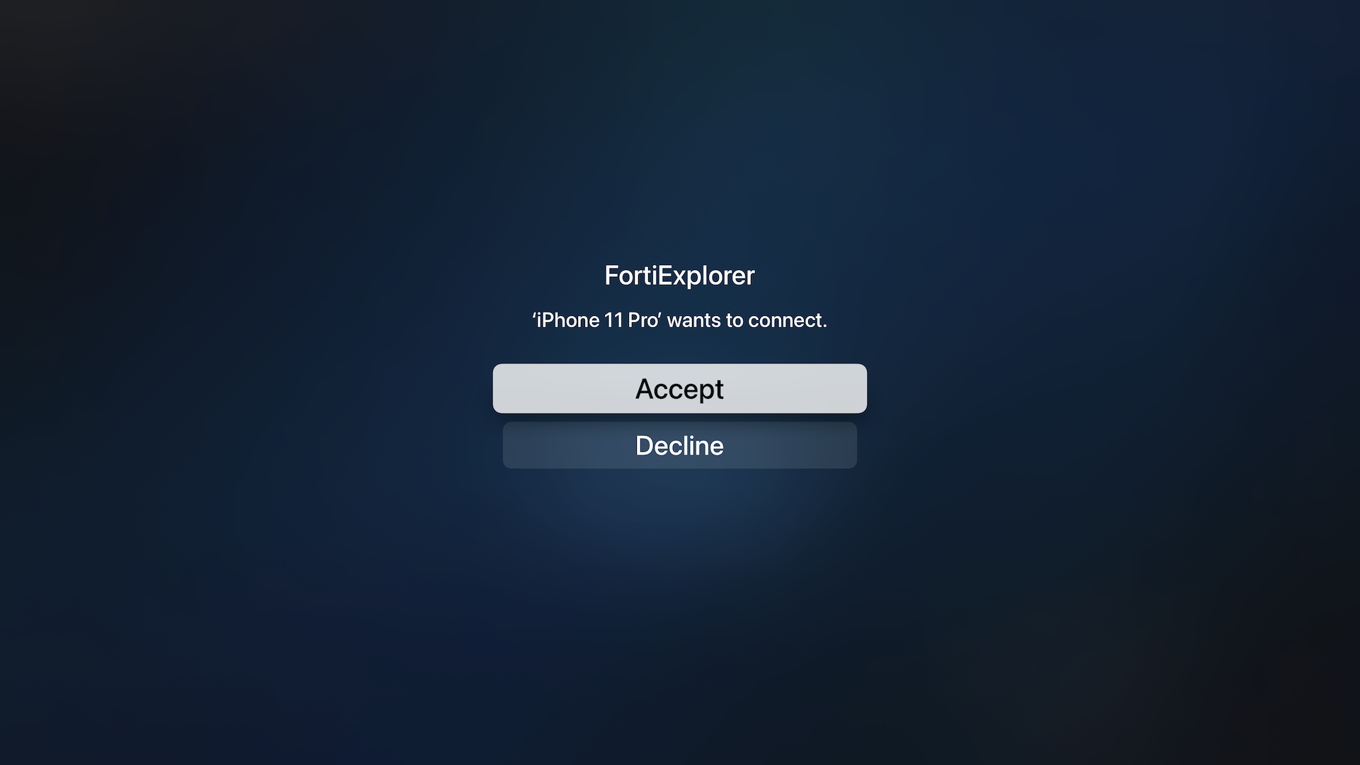 - On Apple TV, click Accept. FortiExplorer for Apple TV confirms the request and proceeds to the device main menu.