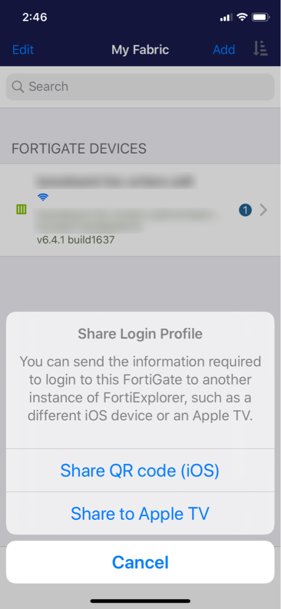 By adding the root FortiGate, you can view the entire topology and navigate to branch FortiGates in the SD-WAN view. If you are already using FortiExplorer on a mobile device, you can connect the same FortiGate device to Apple TV by sharing the login credentials on both devices. Alternatively, you can manually connect to your root FortiGate directly from the app.