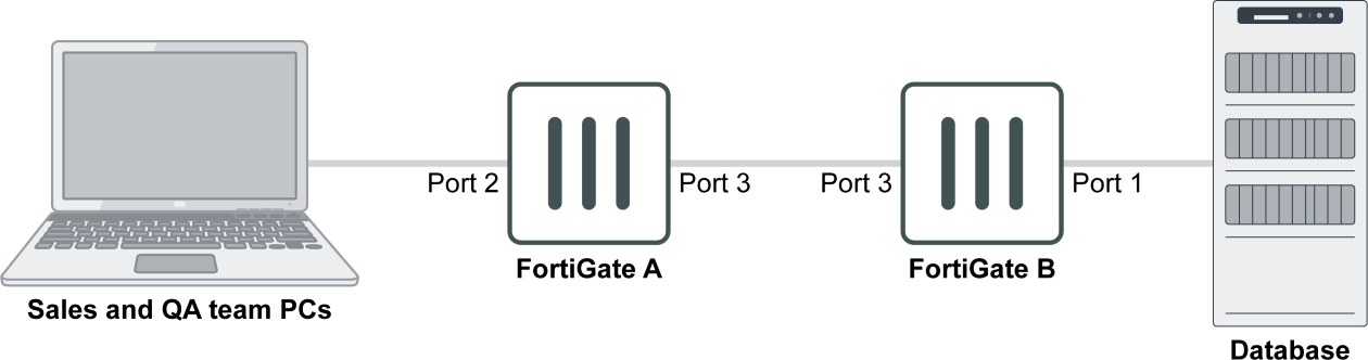 FortiGate A marks traffic from the sales and QA teams with different DSCP values. FortiGate B does DSCP matching, allowing only the sales team to access the database.