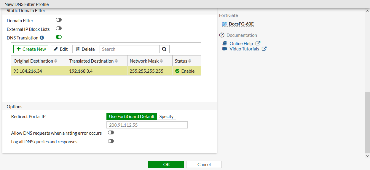 This configuration forces the DNS filter profile to translate 93.184.216.34 (www.example.com) to 192.168.3.4. When internal network users perform a DNS query for www.example.com, they do not get the original www.example.com IP address of 93.184.216.34. Instead, it is replaced with 192.168.3.4.