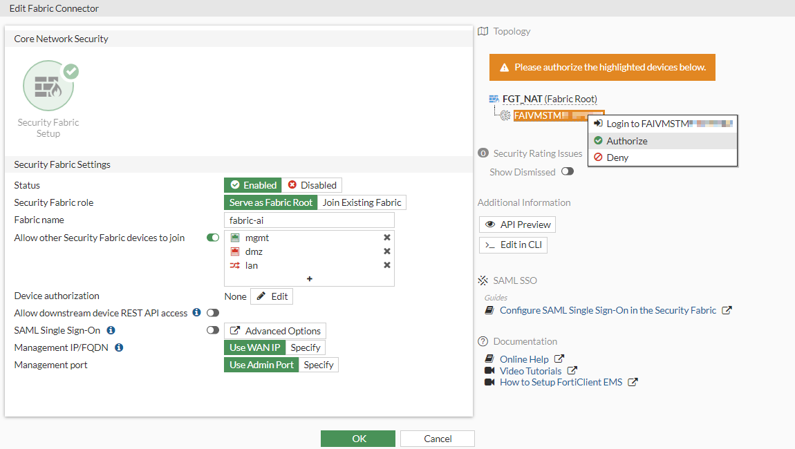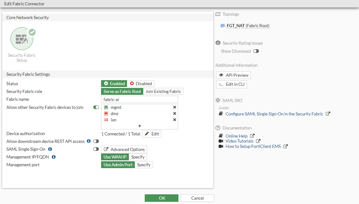 - Go to Security Fabric > Fabric Connectors and double-click the Security Fabric Setup card.
