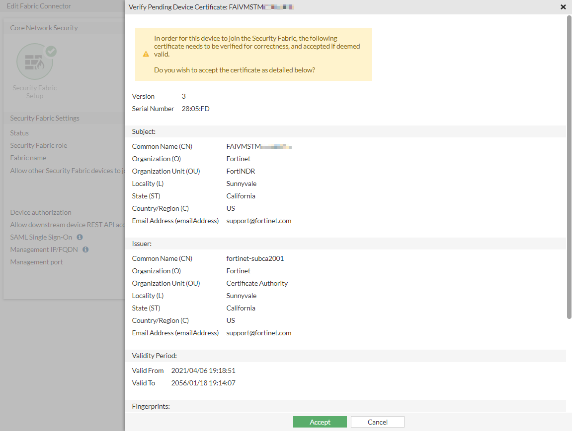 - Configure and authorize the FortiGate in the FortiNDR GUI to join the Security Fabric: