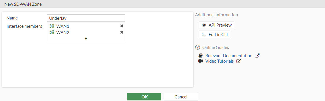 config system sdwan config members edit 1 set interface WAN1 set zone "Underlay" next edit 2 set interface WAN2 set zone "Underlay" next edit 3 set interface VPN1 set zone "Overlay" next edit 4 set interface VPN2 set zone "Overlay" next end end