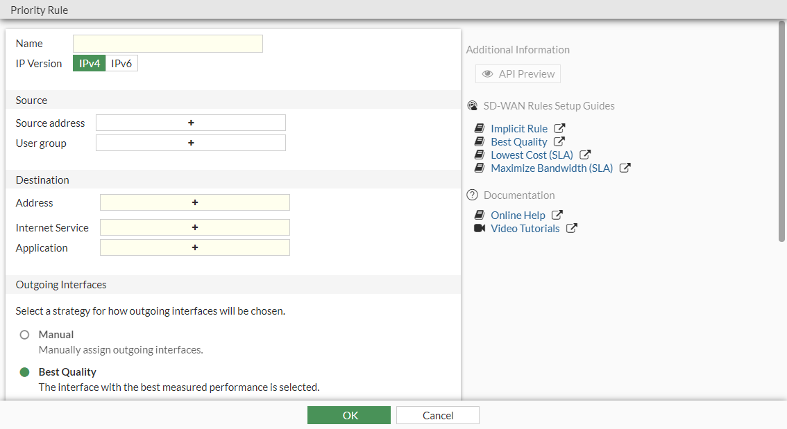 From the GUI, go to Network > SD-WAN > SD-WAN Rules. When creating a new SD-WAN rule, or editing an existing SD-WAN rule, use the Source and Destination sections to identify traffic, and use the Outgoing interfaces section to configure WAN intelligence for routing traffic.